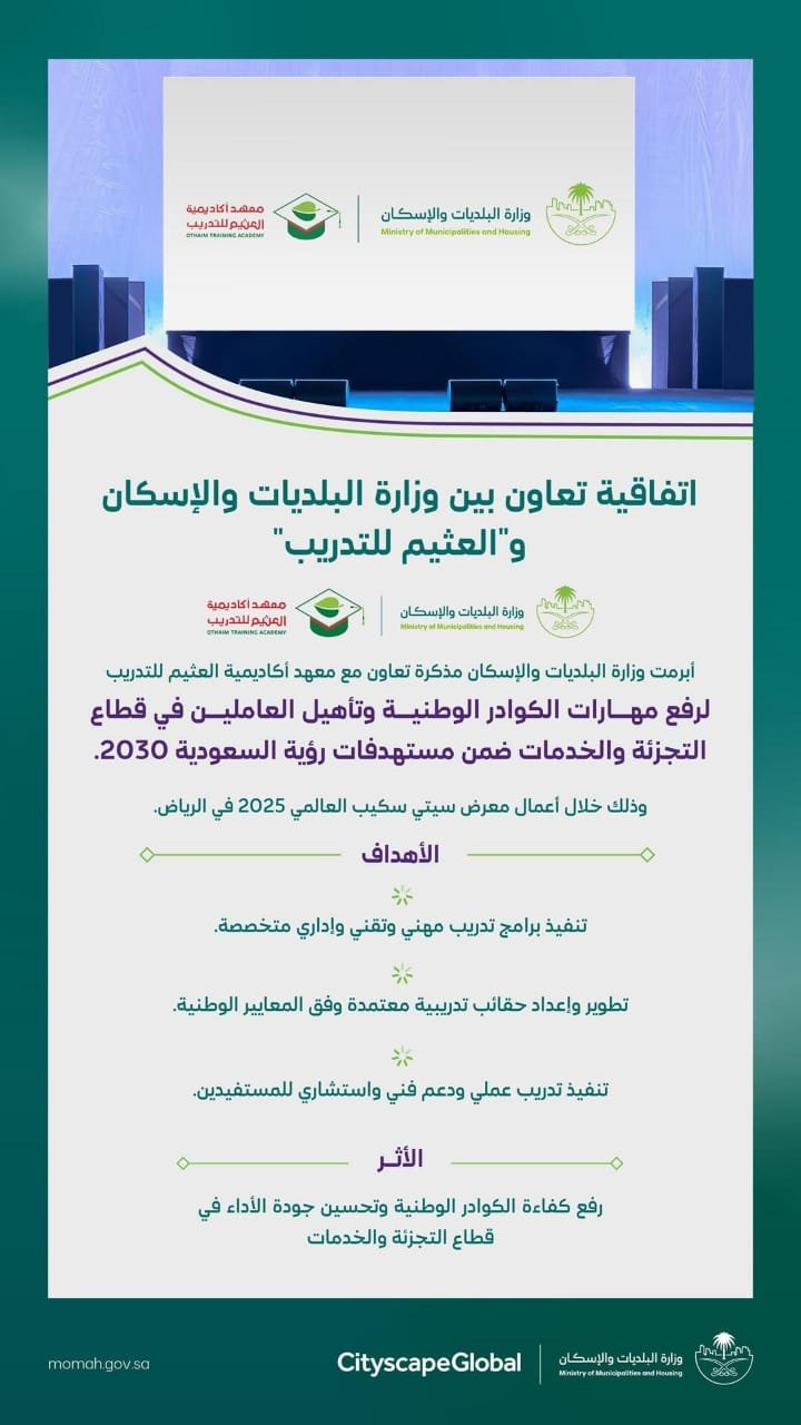 وقّعت وزارة البلديات والإسكان ممثلة في وكالة تنمية القدرات البشرية مذكرة تعاون مع معهد أكاديمية العثيم للتدريب، على هامش أعمال معرض سيتي سكيب 2025، بهدف تطوير وتأهيل الكوادر الوطنية للعمل في قطاع التجزئة والخدمات ورفع كفاءتهم وإنتاجيتهم لدعم مستهدفات رؤية المملكة 2030 وبرنامج التحول الوطني.